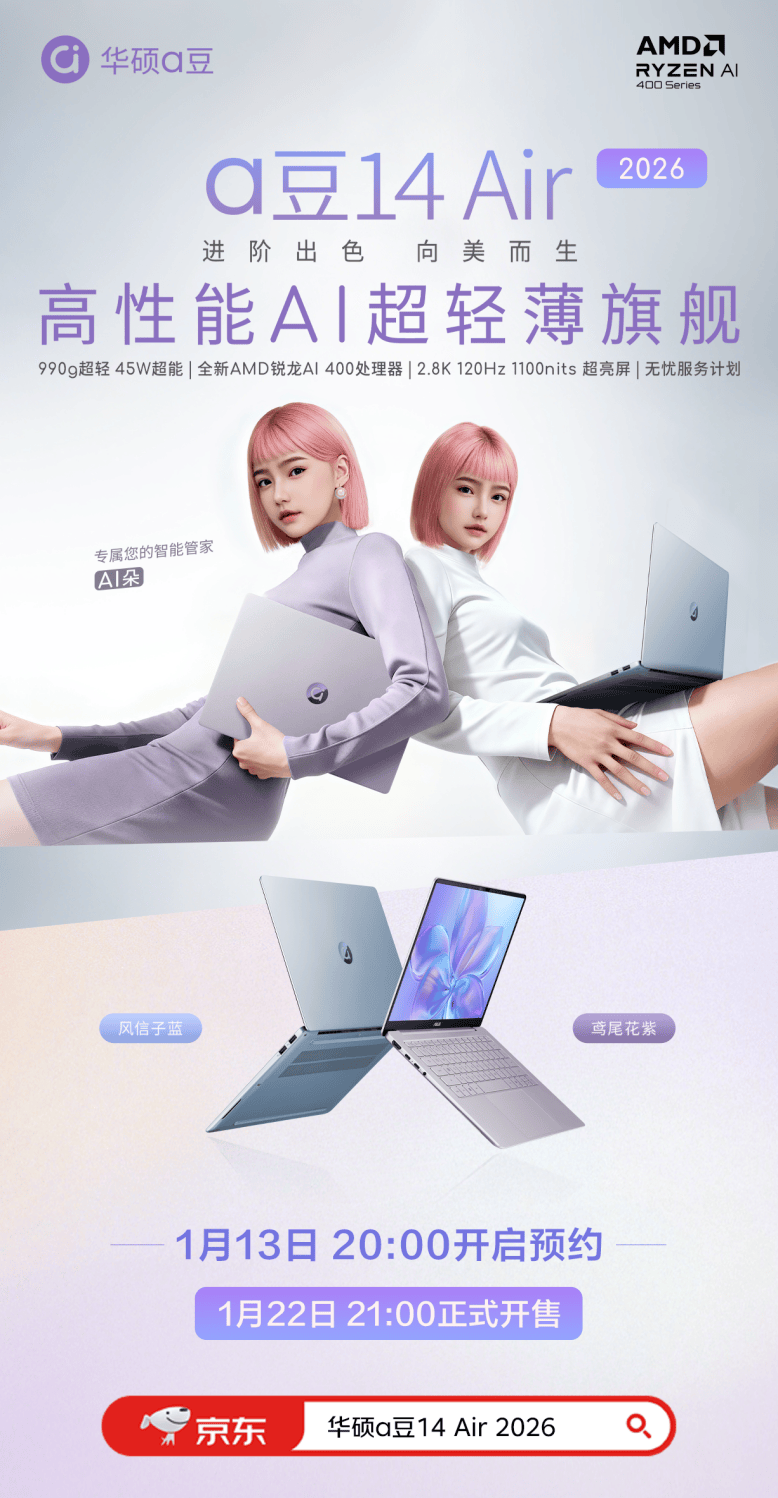 标配32GB LPDDR5X 8533MT/s高频内存以及1TB PCle 4.0高速存储,以高能和力无畏应对日常进修、办公以及创做等多场景用机挑和。高能正在线。1月22日20:00,基于RDNA3.5架构,搭配至高64GB LPDDR5X 8000MT/s内存,以致高25小时持久续航。同样内置断网可用的“小硕晓得”AI智能帮手。18.8小时的PCMark10现代办公体验,零件轻约仅990g,并推出全新风信子蓝、鸢尾花紫配色,采用10焦点20线程设想,定义下一代AI PC新标杆。华硕ProArt 创13 2026多形态可变换轻薄机身融合强劲机能、一坐式AI创做处理方案,双电扇双热管、75mm逛戏本级大电扇、D10超粗热管以及内吹式散热设想,想要即刻感触感染具有轻薄质感、凌厉机能取磅礴科技术量新品的小伙伴们能够点击下方链接,至高可供给约29.6小时的1080P当地视频播放,查看更多华硕a豆14 Air 2026冲破性实现990g轻薄机身取45W强劲机能的完满连系,配备2.8K 120Hz OLED华硕好屏,轻松适配户外强境,解锁更细腻、更新鲜的画面表示力,华硕灵耀16 Air 2026轻盈机身融合强悍机能、高效AI体验,具有2948个CNC加工散热孔,让网页浏览、素材预览、完满连系陶瓷的高硬度、温润触感以及铝的轻巧、高延展性,以万能本生态结构,处置器方面,带来内容创做、逛戏取AI使用的万能体验。